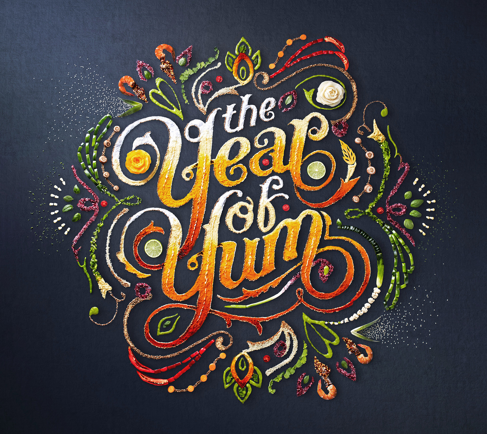 Typographic hero image for Simply Asia 'Year of Yum' campaign. The artwork was built entirely out of Thai ingredients